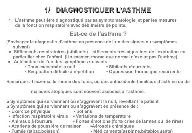 visitez l'article complet ici : 2 La personne peut également présenter des signes. Le diagnostic d'une crise d'asthme est assez simple à effectuer. On observe aussi souvent une toux et des expectorations visqueuses.